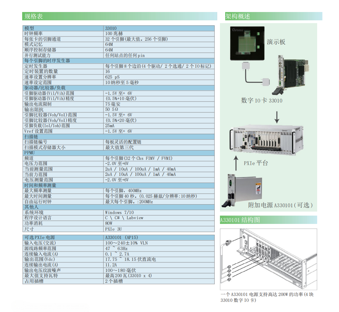 Chroma 33010 是一款高密度 100MHz PXIe 数字IO 卡,设计用于表征、验证和测试各种数字和混合信号 IC。